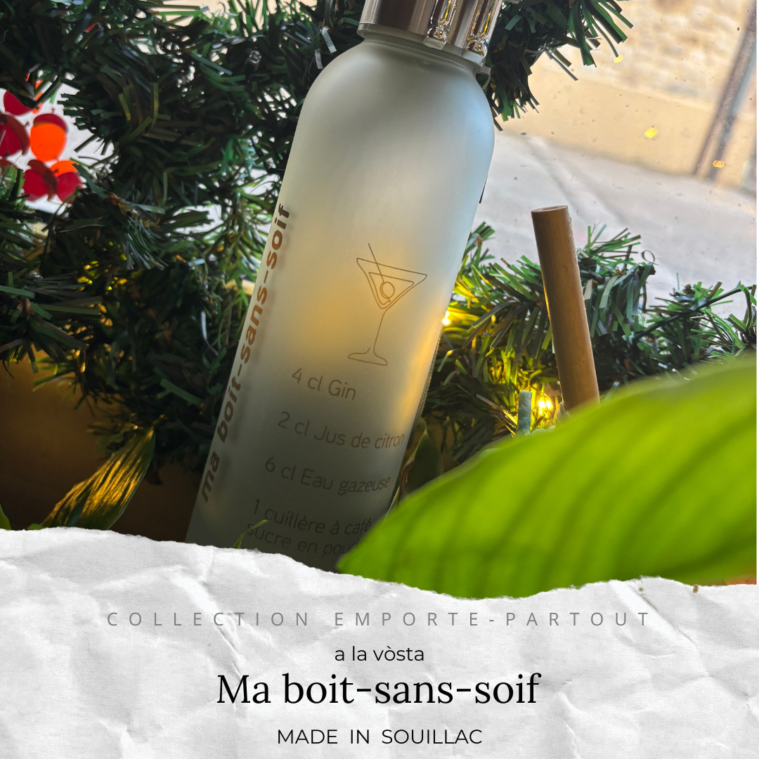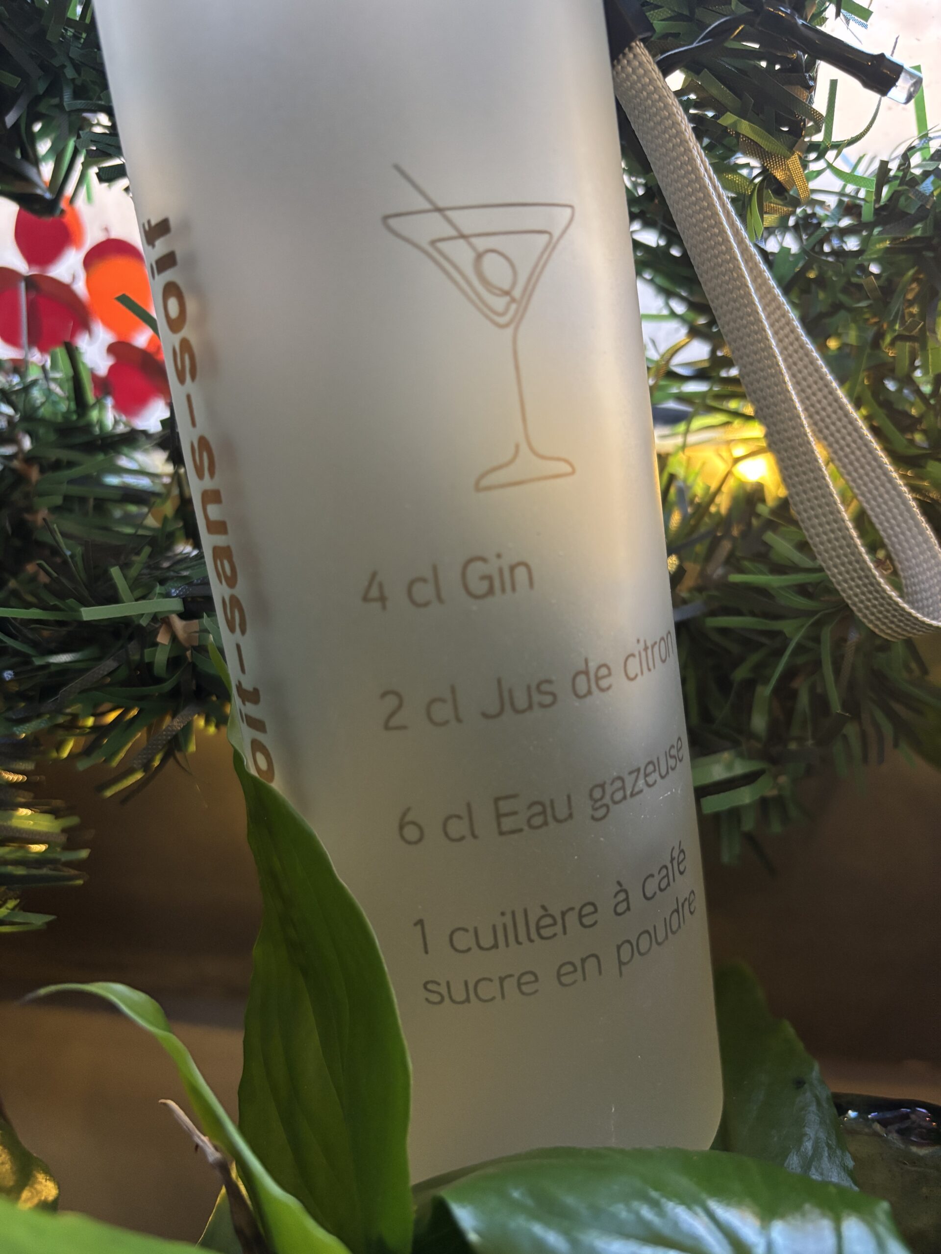 Bouteille en verre, aspect givré… avec la recette de mon cocktail préféré… 😉